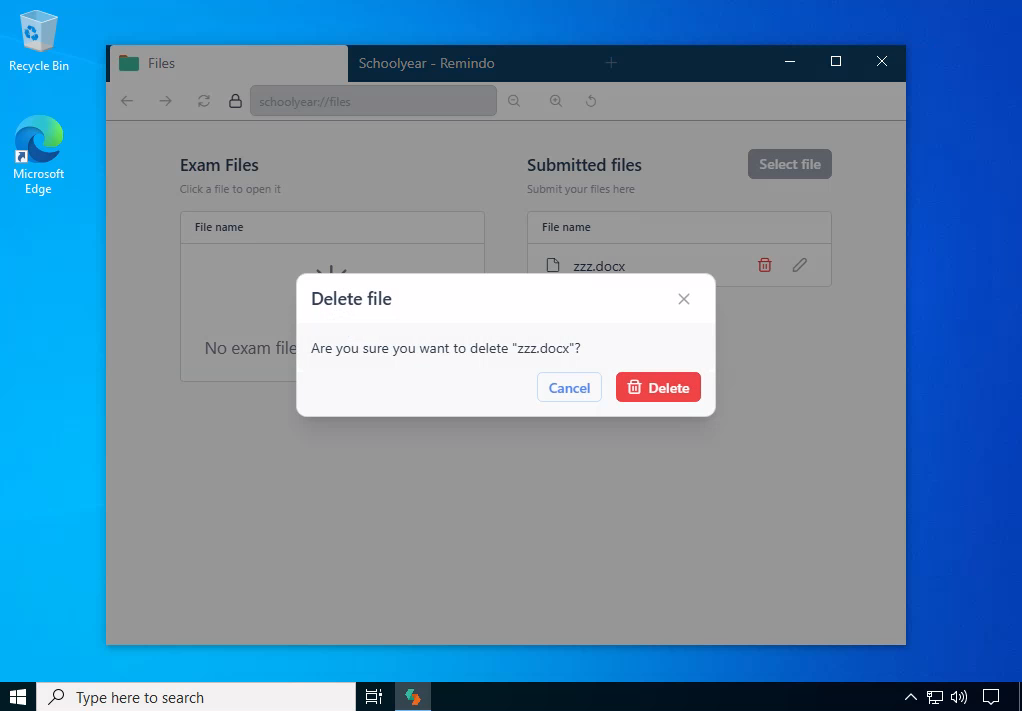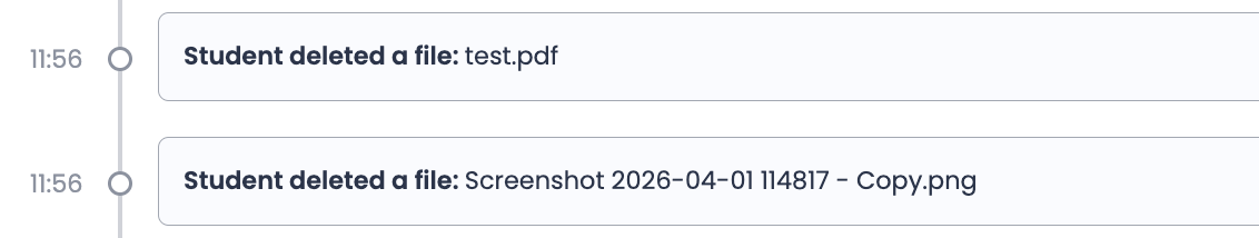 Warning popup when you want to delete an uploaded file in the Schoolyear file picker. Previously, students received no warning here, which could lead to unforeseen situations. In the dashboard, an event will also be displayed for this action. See two examples below: