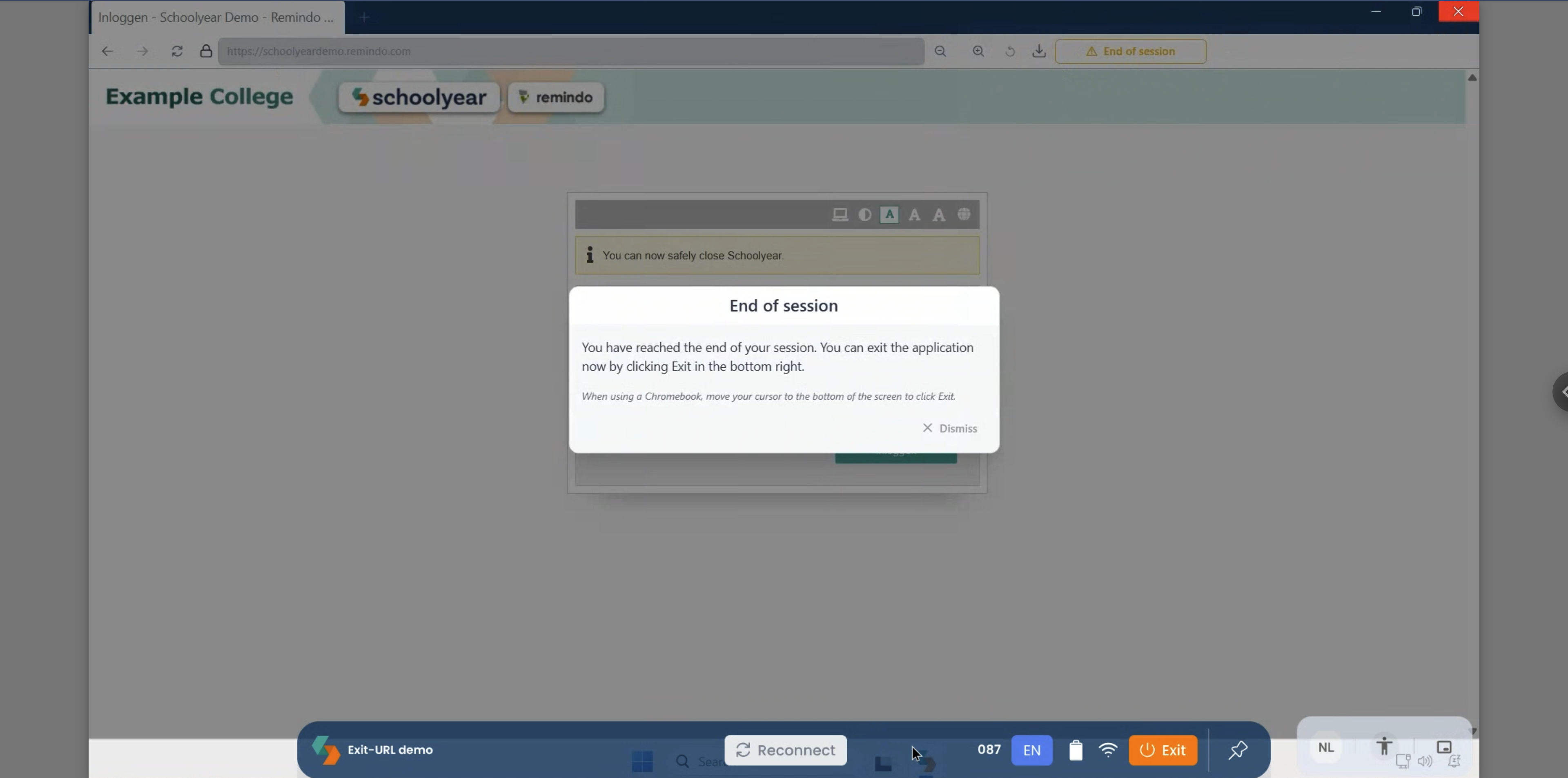 Bugfix rondom de exit-url bij toetsen met Schoolyear AVD: voorheen gebeurde er niets als de eind-pagina van de toets werd bereikt. Met deze nieuwe toevoeging, wordt nu ook bij Schoolyear AVD toetsen een melding getoond op het moment dat het einde van de toets bereikt wordt.