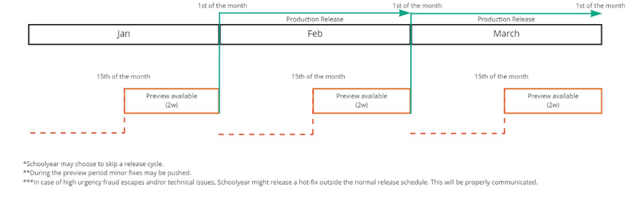 Schoolyear voert geplande releases uit om nieuwe functionaliteiten of verbeteringen beschikbaar te maken. Deze releases vinden doorgaans plaats op de eerste dag van de maand. Het betreft aanpassingen die invloed hebben op de ervaring (UI/UX) van het gebruik van de client (voorbeeld: een nieuwe functionaliteit of een knopje dat van plek veranderd). Omdat dit soort releases mogelijk handleidingen/werkwijzen kunnen beïnvloeden, worden deze releases altijd op de twee weken voorafgaand aan de release aangekondigd middels een Release Notes. Aangewezen Schoolyear key-users zullen deze automatisch ontvangen en klanten hebben de mogelijkheid om meer dan alleen de Key-Users in te schrijven voor de Release Notes. Deze contacten kunnen via support@schoolyear.com worden aangemeld.