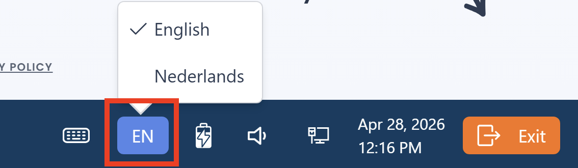 Standaard staat de taal van de Schoolyear applicatie ingesteld in de taal van het besturingssysteem van de computer. Het is mogelijk om de taal van Schoolyear applicatie te wijzigen binnen de beveiligde omgeving tijdens de toets. Gebruik hiervoor de knop rechtsonder naast de 'Afsluiten' knop. Schoolyear is beschikbaar in Nederlands en Engels.